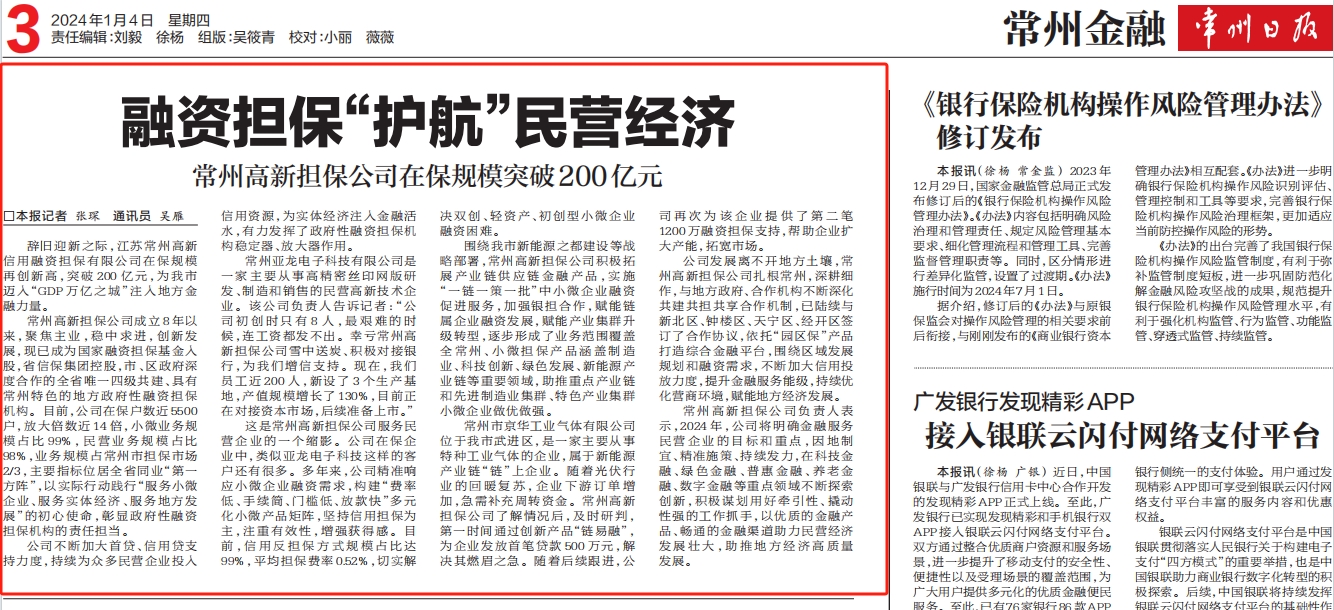 辭舊迎新之際,江蘇常州高新信用融資擔保有限公司在保規(guī)模再創(chuàng)新高,突破200億元,為我市創(chuàng)建“GDP萬億之城”注入地方金融力量。